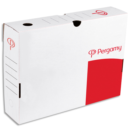 Pergamy boîte archive dos 10 cm. montage automatique. kraft ondulé. blanc imprimé rouge