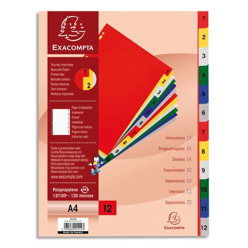 Exacompta jeu d'intercalaires numériques en polypropylène. 12 touches multicolores. format a4.