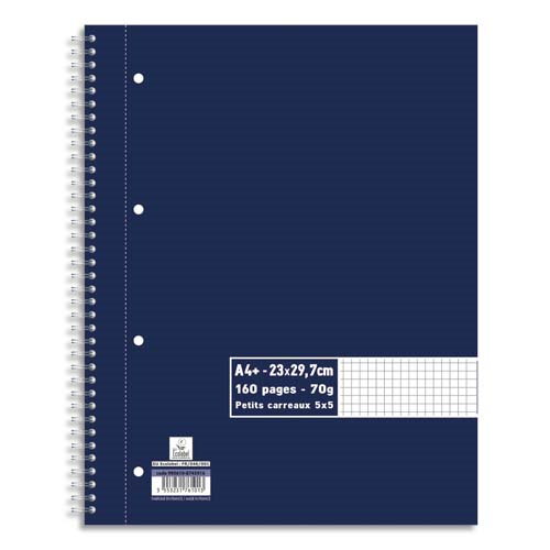 Cahier spirale a4+ 160 pages 70g petits carreaux 5x5. couverture carte souple bleu marine