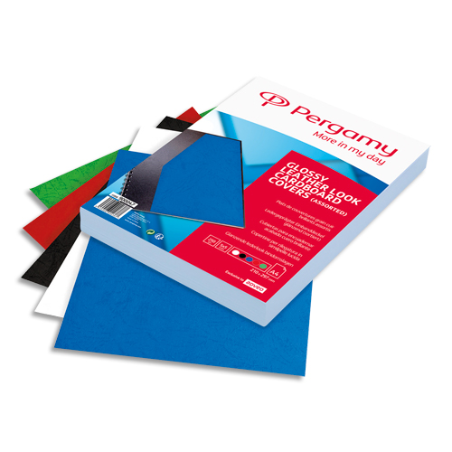 Pergamy boîte 25 plats couverture grain cuir a4 250g assortis:5xblanc,5xrouge,5xbleu,5xnoir,5xvert 900047