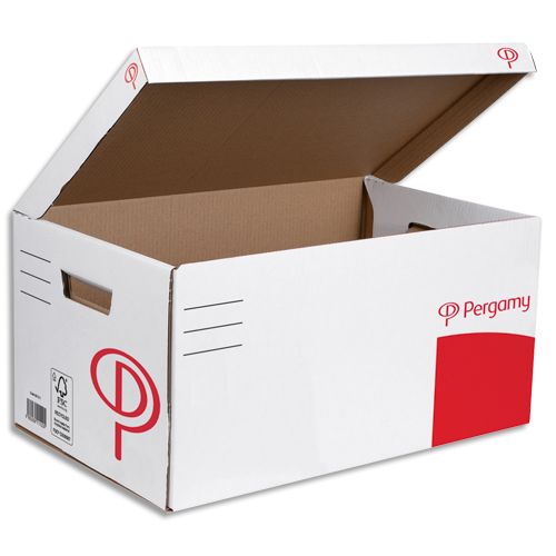 Pergamy conteneur ouverture dessus, couvercle attenant. montage manuel. kraft ondulé.blanc imprimé rouge.