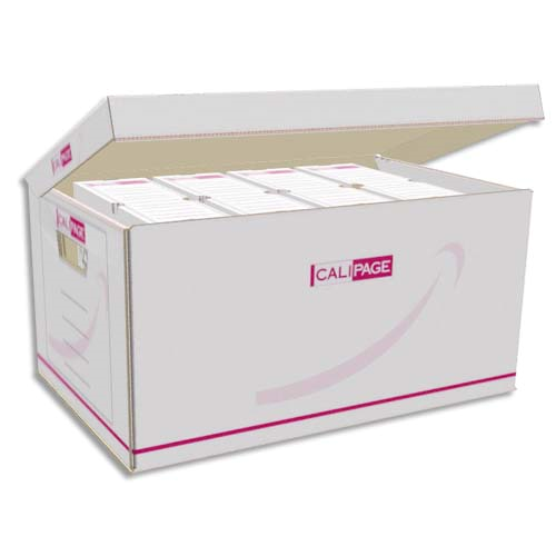Calipage conteneur ouverture sur le dessus, couvercle attenant. montage manuel. carton blanc.