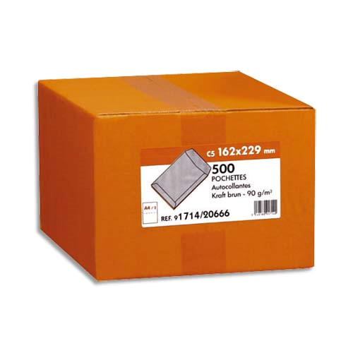 Boîte de 500 pochettes kraft brun 90g c5 162x229 mm auto-adhésives