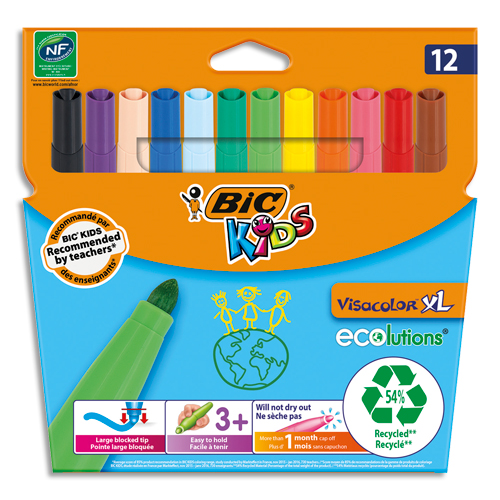 Bic kids visacolor xl feutres de coloriage à pointe large - couleurs assorties, etui carton de 12